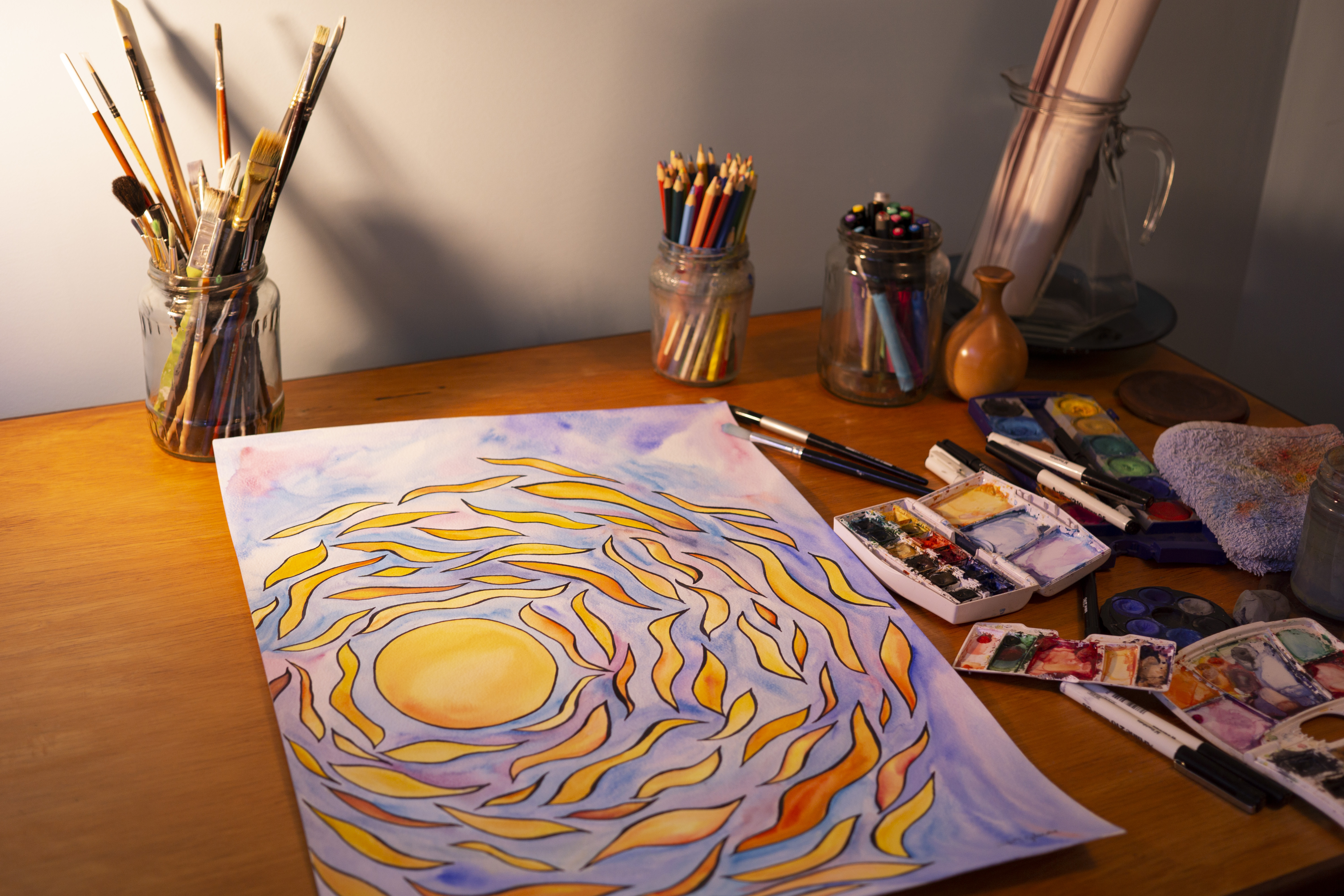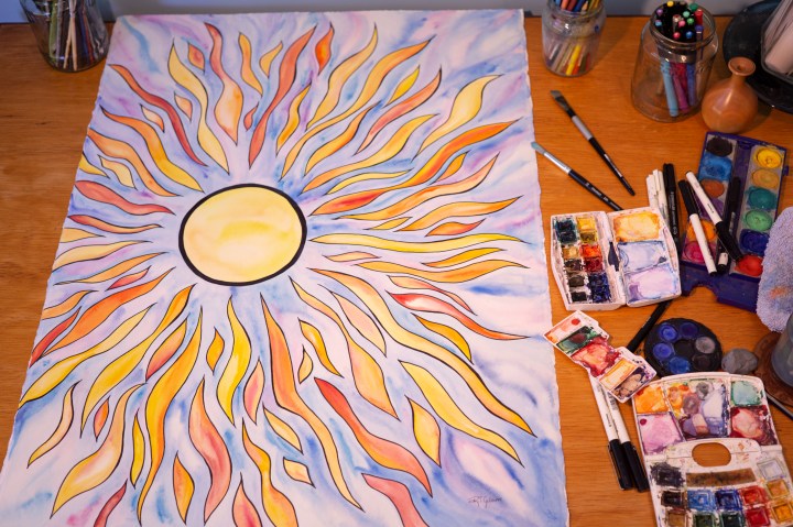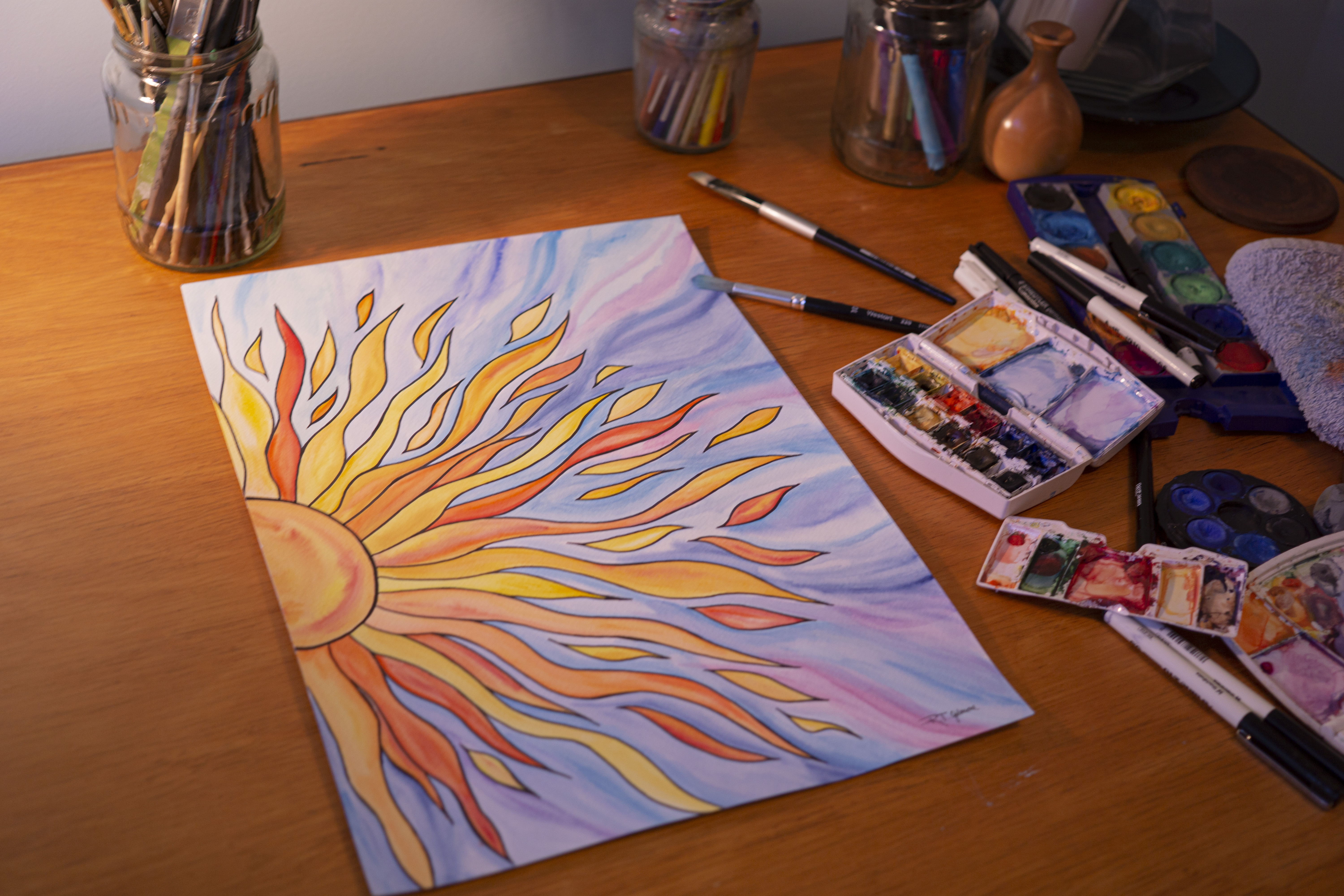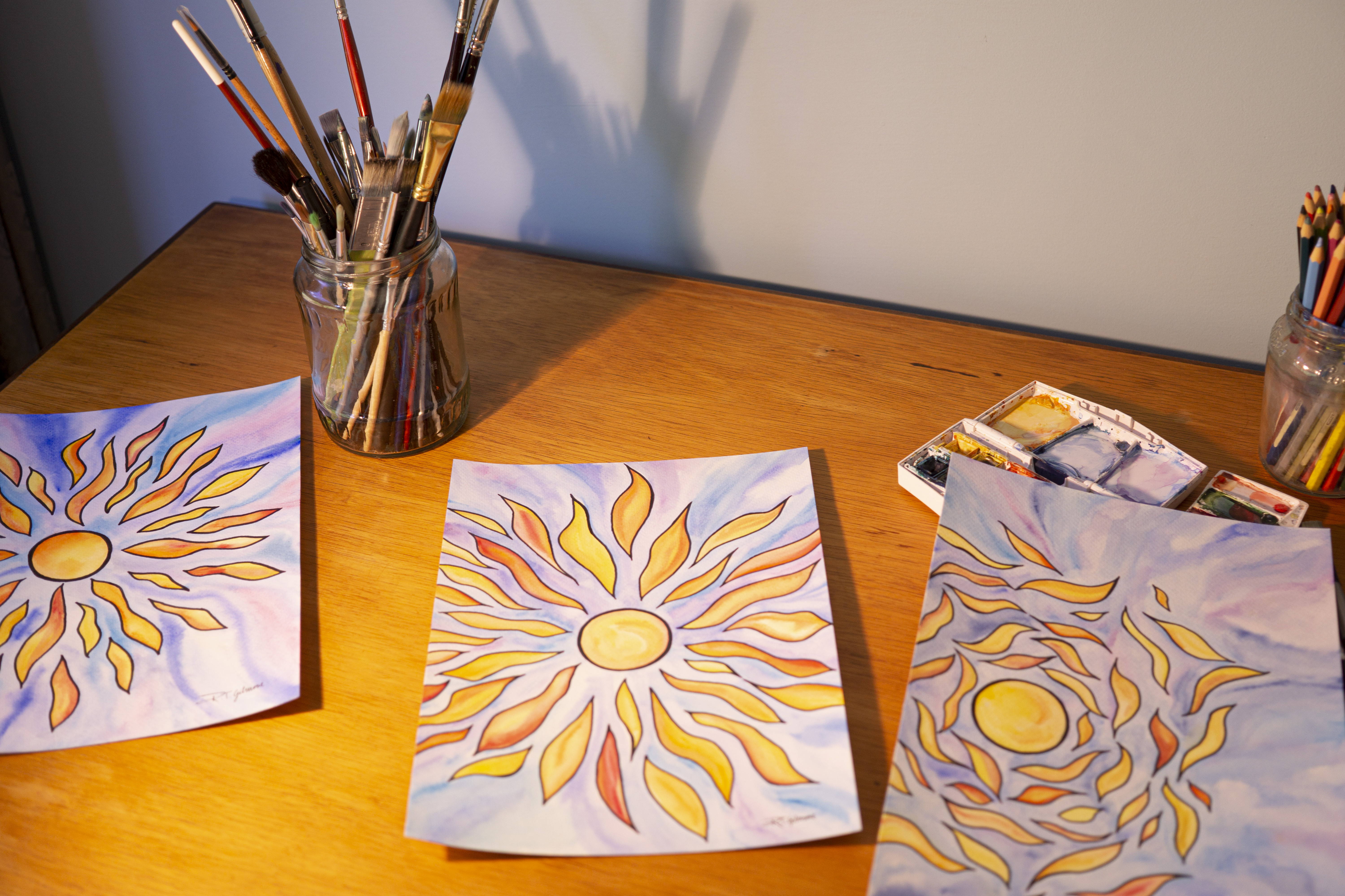 I decided it was time to start a new sketchbook, to collect ideas. I wanted to paint about something I could get excited about. With so much uncertainty it was hard to get excited about anything. I was just about to go into my first summer in six years, so as a warm up and to have a little bit of a theme to get colours flowing on the page, I painted a sun.