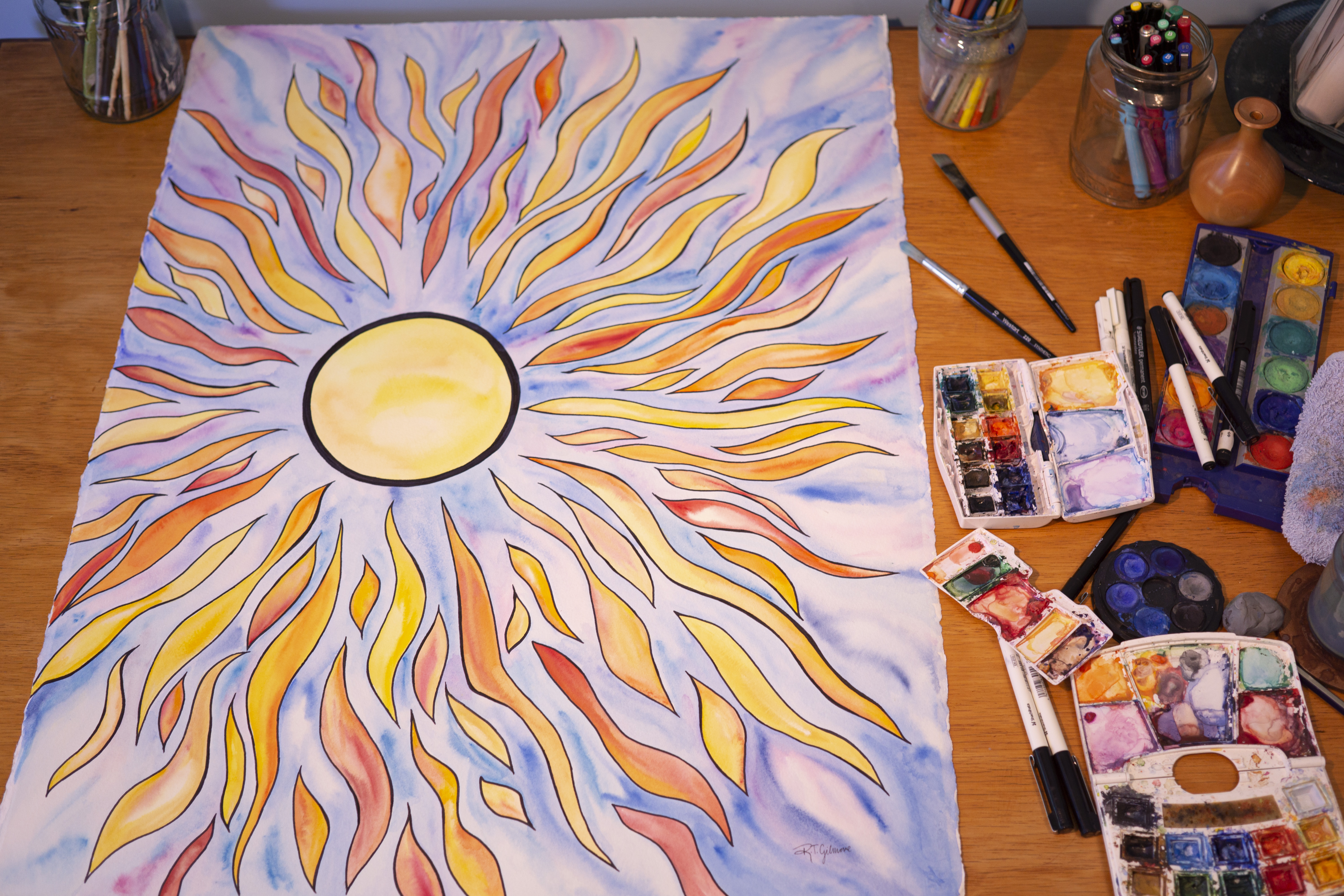 2. The Sun paintings bring happiness to the for. Your bright flowing style always lifts my spirits to see expressed in your art. One thing I learnt as a counsellor in my years when that was my profession is that when we feel happy and strong we act that way but the reverse is also true. When we do the things we do when happy and strong the feeling comes too. Call it muscle memory if you like. I love your work. ๐Ÿ’œ